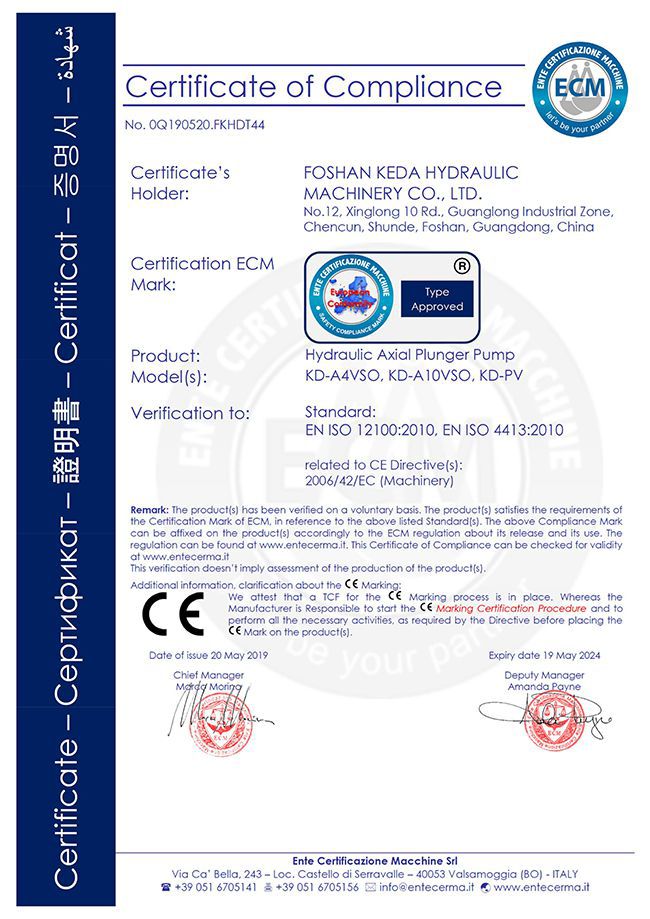 شهادة السلامة الأوروبية سي إي (شهادة CE) للمضخات المكبسية الهيدروليكية سلسلات KD-A4VSO, KD-A10VSO, KD-PV