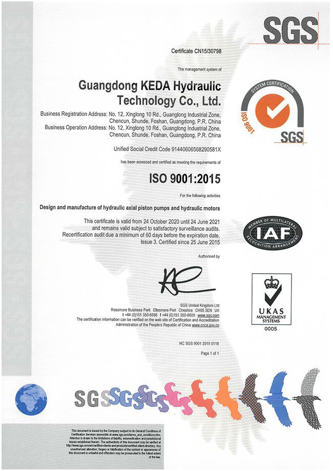 شهادة الجودة العالمية ISO 9001:2015 (لتصميم وتصنيع المضخات الكباسية المحورية للأنظمة الهيدروليكية وكذلك المحركات الهيدروليكية)
