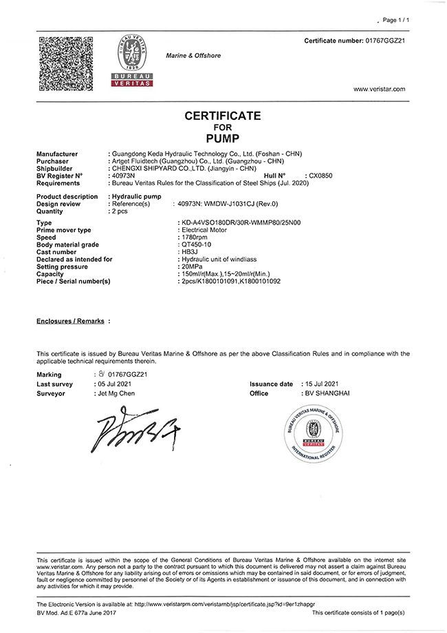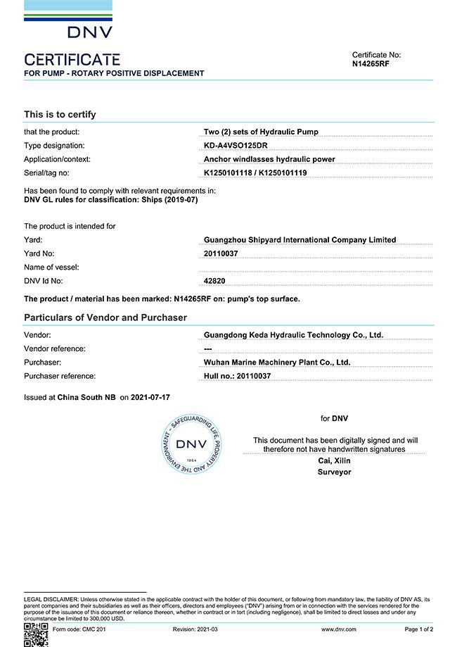 شهادة BV (للمضخة الهيدروليكية KD-A4VSO180DR)