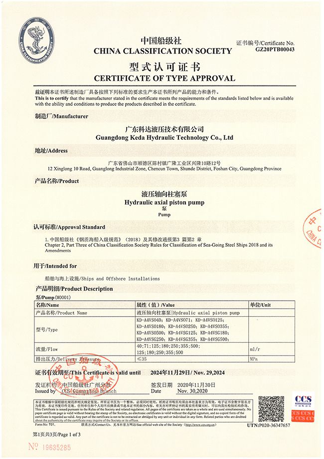 شهادة اعتماد النوع من مؤسسة التصنيف الصينية (لمضخة المكبس المحوري الهيدروليكي)